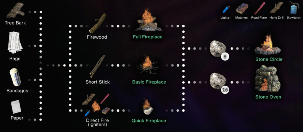Tree Bark, Rags, Bandages, Paper + Direct Fire (Igniters)