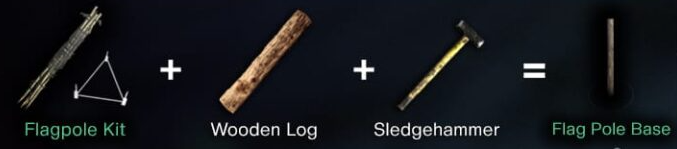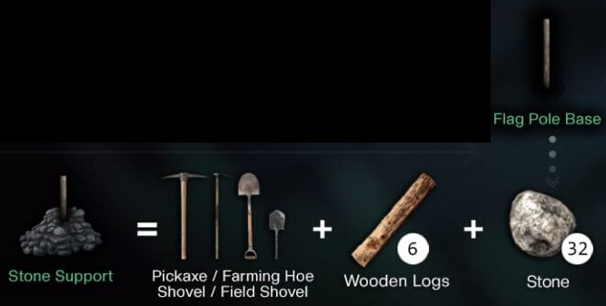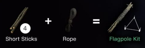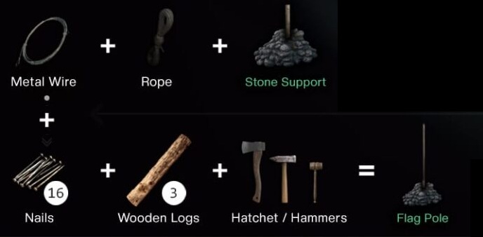Stone Support + Rope + Metal Wire + 16x Nails + 3x Wooden Log = Hatchet / Hammer = Flag Pole