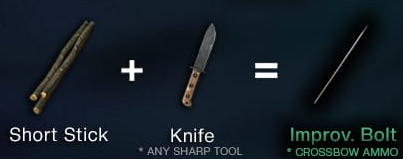 Crafting Improvised Bolt (Crossbow Ammo) Short Stick + Knife (Any Sharp Tool) = Improvised Bolt (Crossbow Ammo)