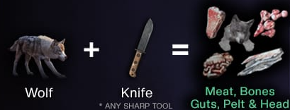 Crafting Meat, Bones, Guts, Pelt & Head Wolf + Knife (Any Sharp Tool) = Meat, Bones, Guts, Pelt & Head