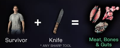 Crafting Mięso, kości i wnętrzności Ocalały + Nóż (dowolne ostre narzędzie) = Mięso, kości i wnętrzności