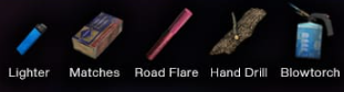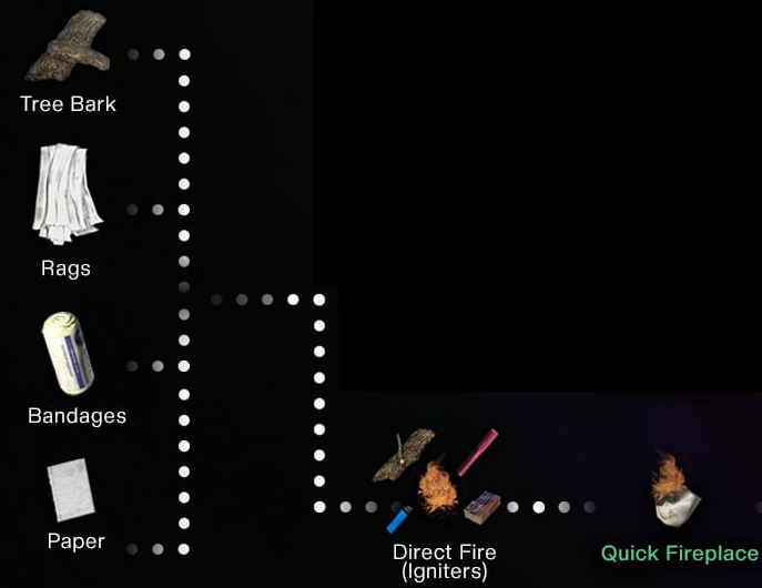Crafting Quick Fireplace Tree Bark, Rags, Bandages, Papers + Direct Fire = Quick Fireplace * Direct Fire (Igniters) – Lighter, Matches, Road Flare, Hand Drill, Blowtorch
