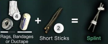 4x Rags, Bandages, Ductape + 2x Short Sticks = Splint