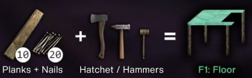 10x Planks + 20x Nails + Hatchet / Hammers = F1: Floor
