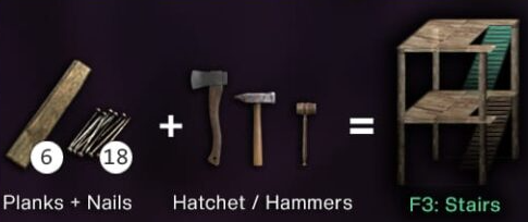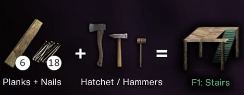 6x Planks + 18x Nails + Hatchet / Hammers = F1: Stairs